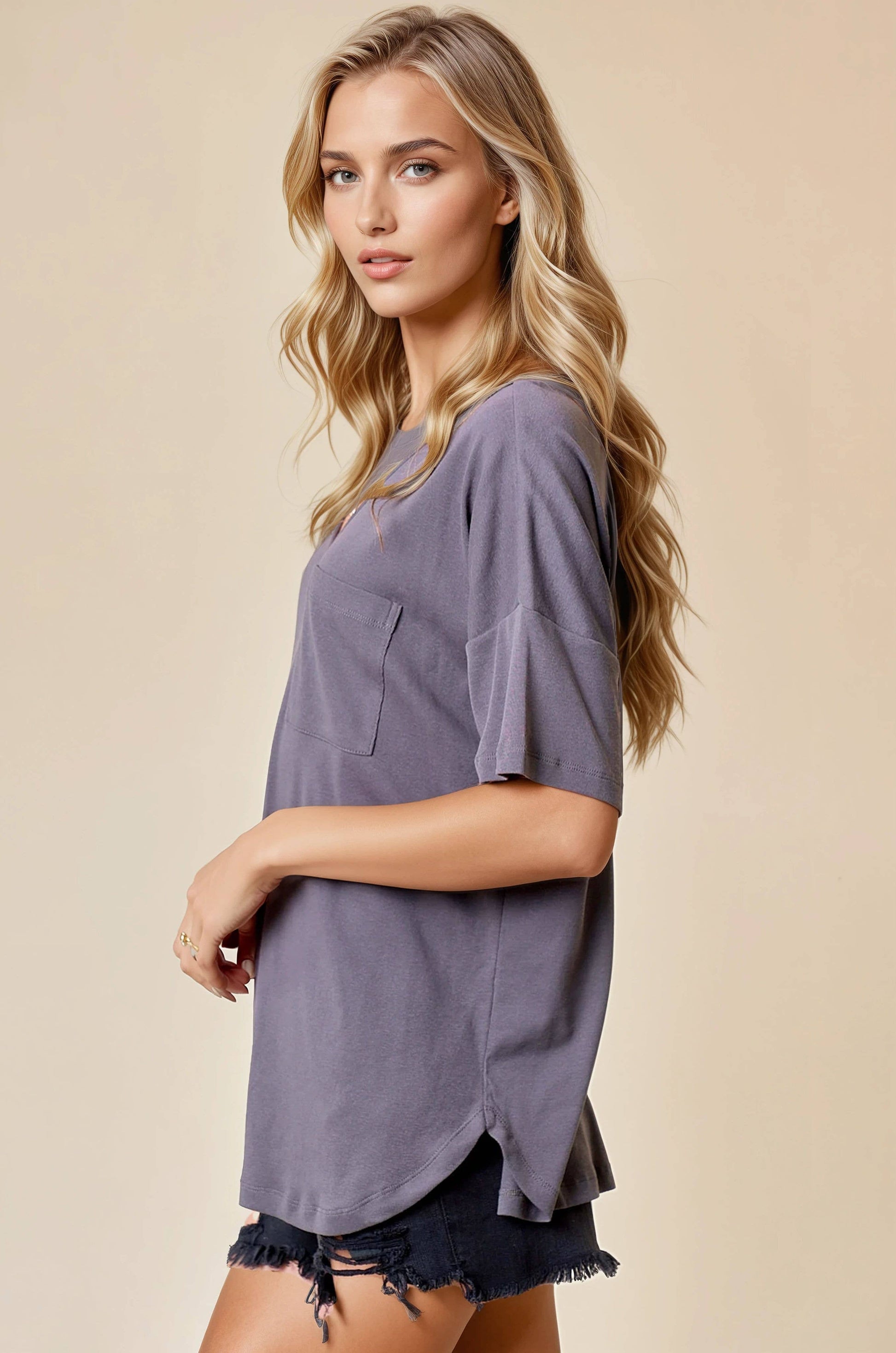 Relaxed, oversized silhouette for ultimate comfort and style - Flattering V-neckline. Short sleeves with a dropped shoulder. Single chest pocket adds a casual, functional detail STYLE MEASUREMENTS (SIZE SMALL) - TOTAL LENGTH 28 1/4" - BUST 23" - SLEEVE LENGTH 5" - SHOULDER 25 1/2" 85%COTTON, 15%POLYESTER MODEL IS 5'10" | BUST 34" | WAIST 24" | HIPS 35" WEARING SIZE S
