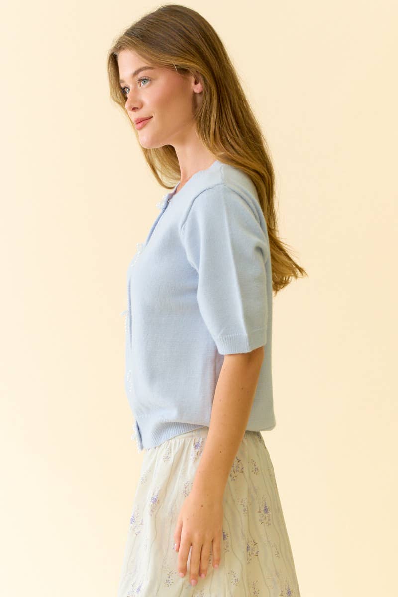 - Style: Pearl Bow Button Short Sleeve Cardigan