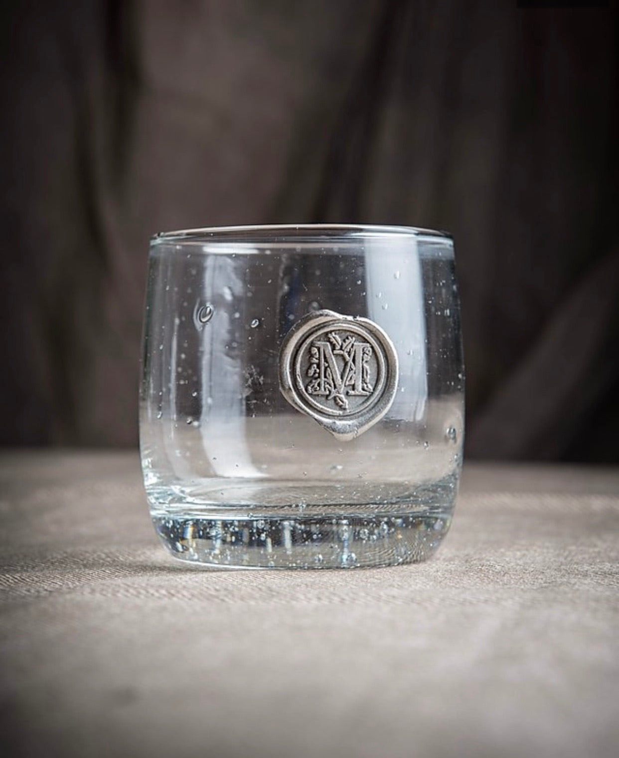 Hand-blown glass with pewter initial seal. Sold individually.